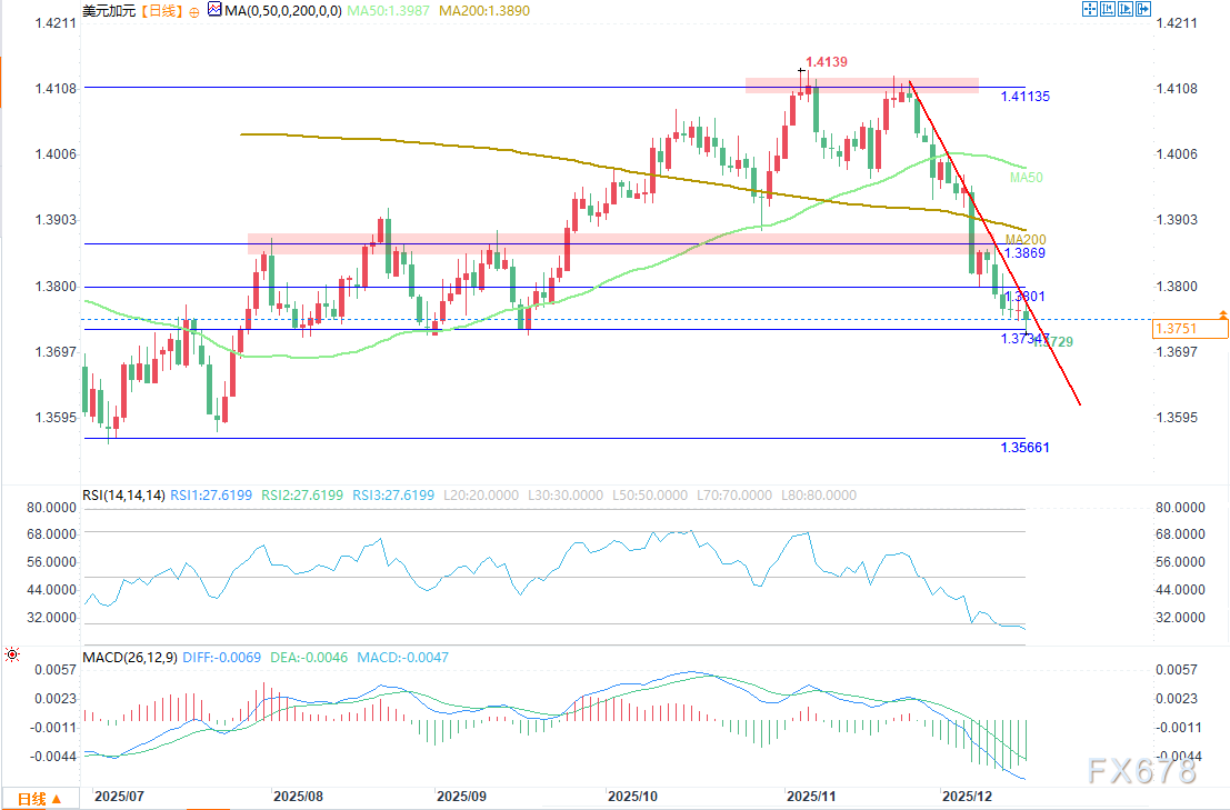 新下行趋势形成:自11月汇率触及高点以来,美元/加元已逐步构建起新的短期下行趋势。在此过程中,多头并未展开有力反攻,这一下行趋势也因此成为主导短期行情的核心技术结构。不过,鉴于近期抛售力度较大,汇率可能出现短期反弹修正。这类反弹虽不足以逆转整体下行趋势,但或令未来几个交易日市场呈现短暂的看涨情绪。
