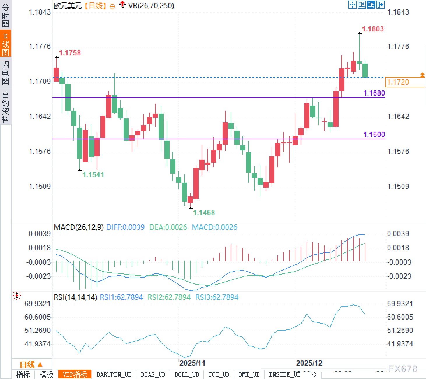 技术形态也在强化这种“高位谨慎”的气氛。日线图上,欧元兑美元前高在1.1803附近,1.1800一带既是心理关口,也是9月下旬以来的关键回补区域,短线突破后未能站稳,容易触发部分资金将其视为阶段性压力区。当前1.1720处于上升波段的中上部,1.1680附近存在一条较清晰的水平支撑带,若回撤加深,1.1600附近则是更靠下的结构支撑。