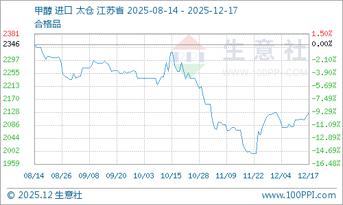 据生意社商品行情分析系统,12月8日至12月17日(截止15:00),国内甲醇市场华东港口报价自2090元/吨上涨至2140元/吨附近,价格环比上涨5.16%,同比下跌18.74%。近期国内甲醇市场受运费支撑,局部价格表现坚挺。而港口市场则面临“库存高企、供应压顶”的双重压力。