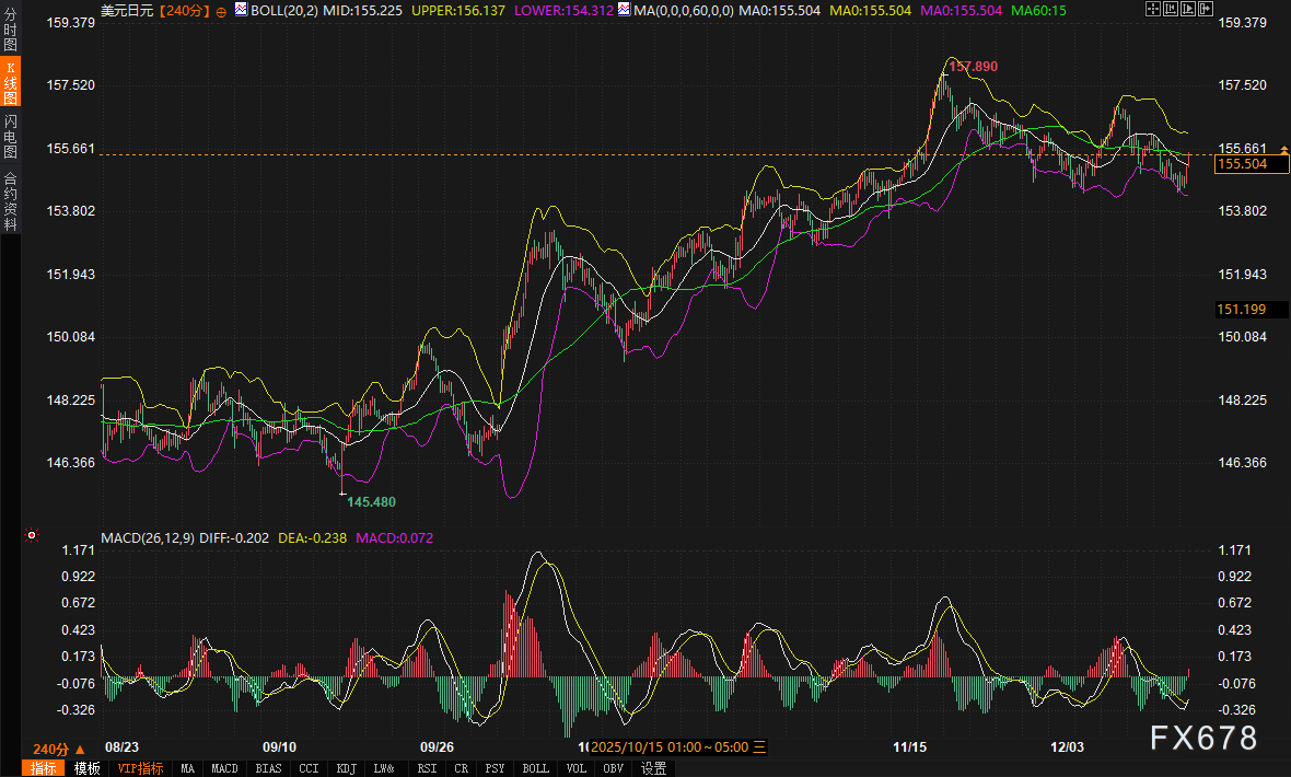 若市场对日本财政扩张的担忧持续,且未有日本央行官员释放强烈的遏制收益率上行的口头干预信号,那么10年期日债收益率将维持在当前高位(1.96%-1.98%区间)震荡,并反复试探2.00%这一关键心理与技术关口。在此期间,任何弱于预期的日本央行购债操作或关于预算的更多细节,都可能引发短暂的突破。对应地,美元兑日元将主要受到日债收益率走势的牵引。只要收益率不出现大幅回落,美元兑日元将获得支撑,有望上探布林带上轨156.14附近区域,甚至测试近期波动区间上沿。然而,年末流动性下降可能放大波动,限制单边趋势的流畅度。