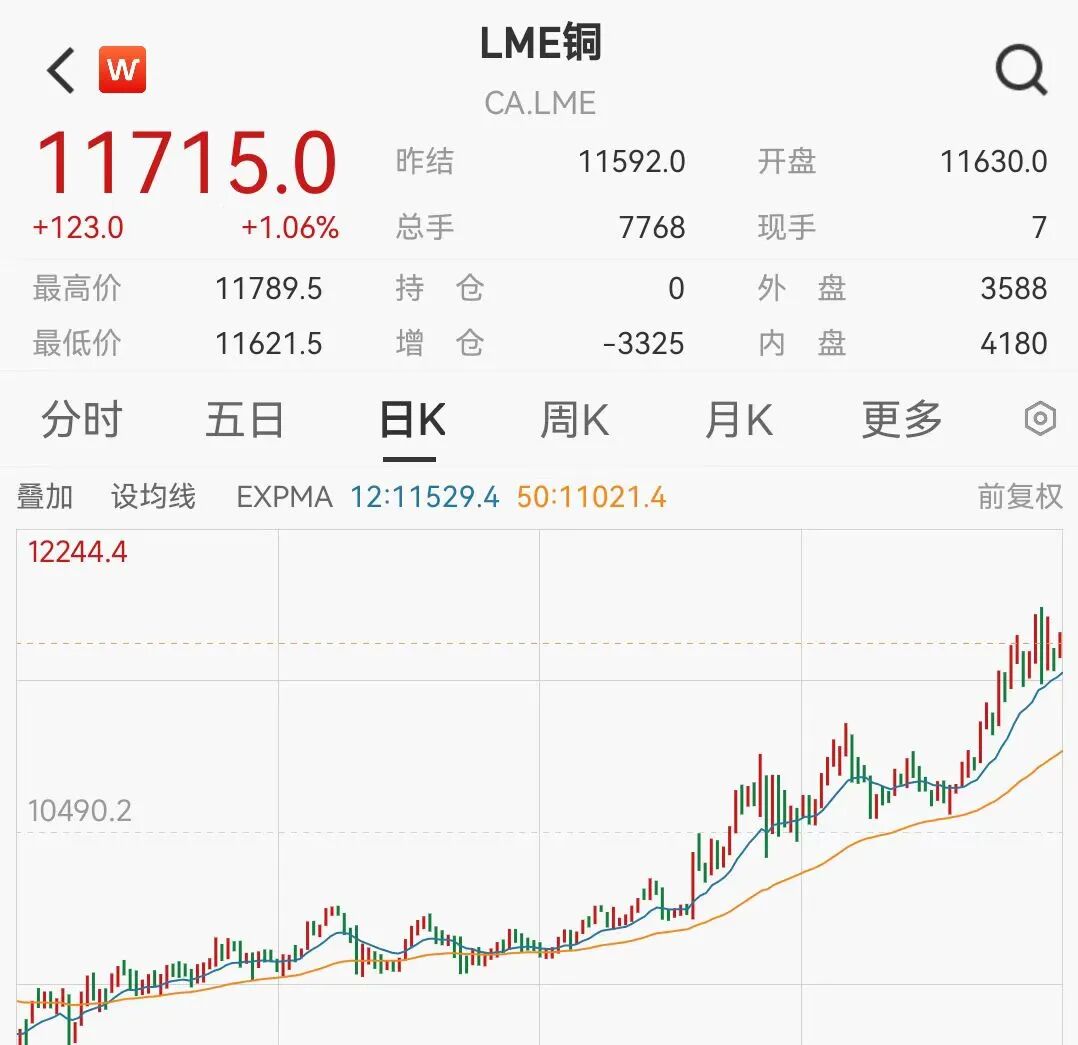 伦敦金属交易所(LME)三个月期铜的走势可谓芝麻开花节节高,12月12日盘中一度触及11952美元/吨的历史新高。此后,铜价高位震荡,截至12月17日20时LME铜价达到11715美元/吨。与此同时,沪铜主连当日上涨0.4%,收报92820元/吨。