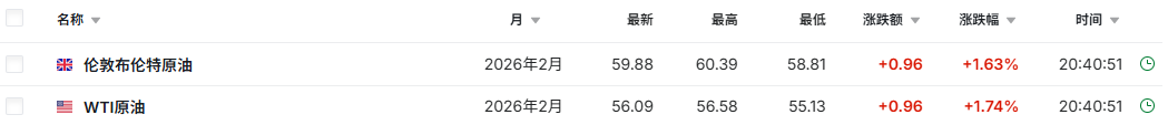 3. 截至发稿,WTI原油涨1.74%,报56.09美元/桶。布伦特原油涨1.63%,报59.88美元/桶。