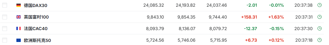 2. 截至发稿,德国DAX指数跌0.01%,英国富时100指数涨1.63%,法国CAC40指数跌0.15%,欧洲斯托克50指数涨0.12%。