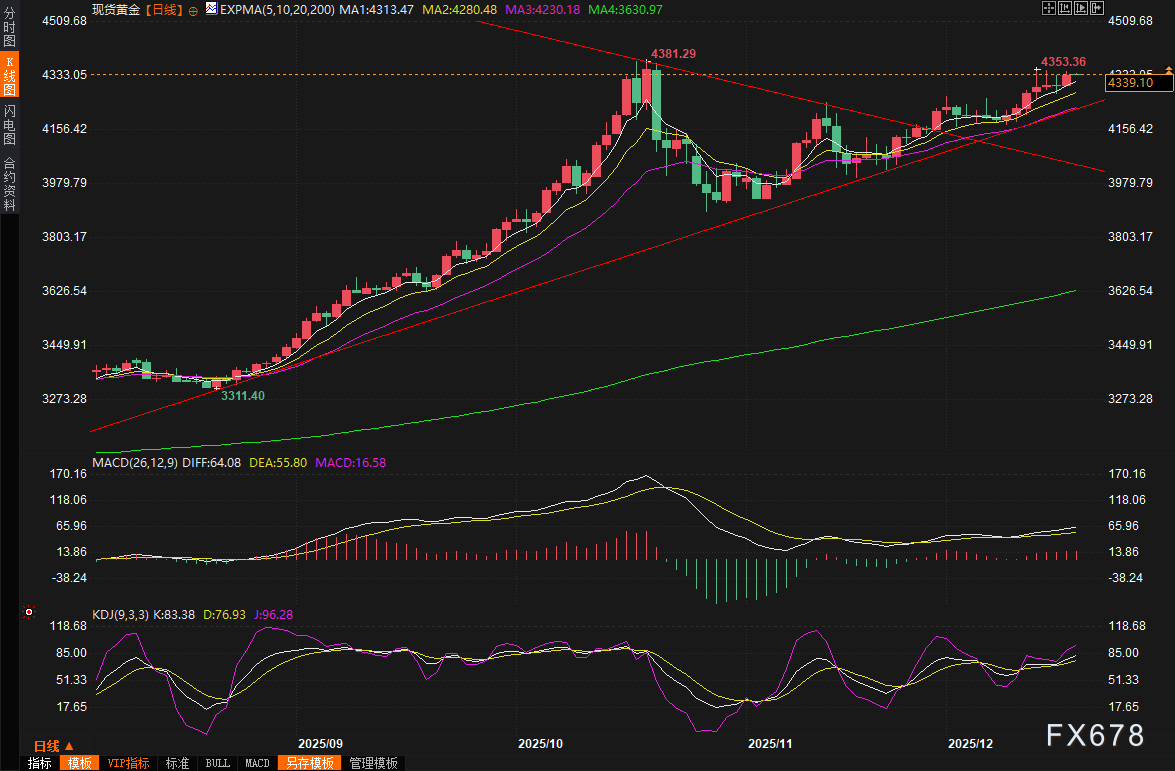 汇通财经APP讯——在2025年年末的全球金融市场中,黄金价格犹如脱缰野马般强劲上扬,受到美国就业数据疲软、美联储降息预期重燃以及地缘政治紧张局势升级等多重因素的合力推动,周三(12月17日)现货黄金价格继续攀升,盘中最高曾触及4348.70美元/盎司,收报4338美元/盎司附近,涨幅接近1%。与此同时,白银价格更是突破66美元大关,创下历史新高66.88美元/盎司,铂金也触及逾17年最高点。周四(12月18日)亚市早盘,现货黄金窄幅震荡,目前交投于4340美元/盎司附近,本交易日重点关注特朗普的全国讲话和延迟公布的美国11月CPI数据。