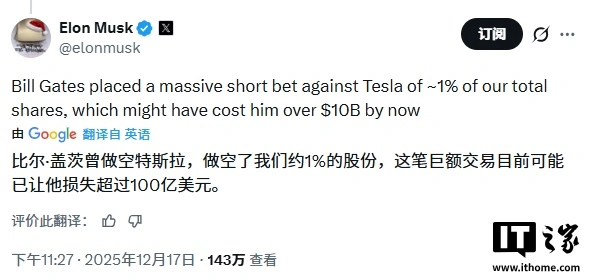 IT之家12月18日消息,伊隆马斯克就比尔盖茨做空特斯拉一事再次向这位微软前首席执行官发难,多年来二人已因此事产生不少矛盾。