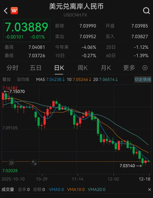近期,人民币兑美元汇率持续走高,在岸、离岸频频创逾一年来新高。其中,美元兑离岸人民币汇率已击穿7.04关口,截至发稿,报7.03889。