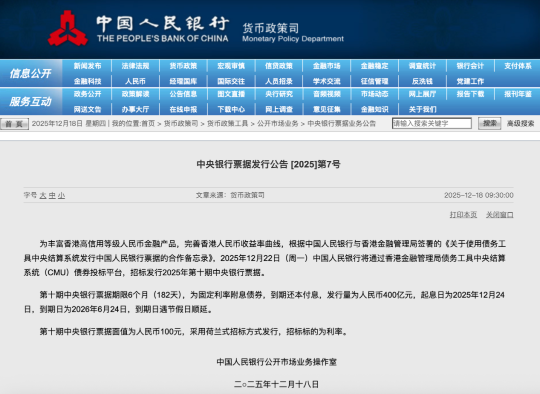 12月18日,中国人民银行官网发布消息称,为丰富香港高信用等级人民币金融产品,完善香港人民币收益率曲线,根据中国人民银行与香港金融管理局签署的《关于使用债务工具中央结算系统发行中国人民银行票据的合作备忘录》,2025年12月22日(周一)中国人民银行将通过香港金融管理局债务工具中央结算系统(CMU)债券投标平台,招标发行2025年第十期中央银行票据。