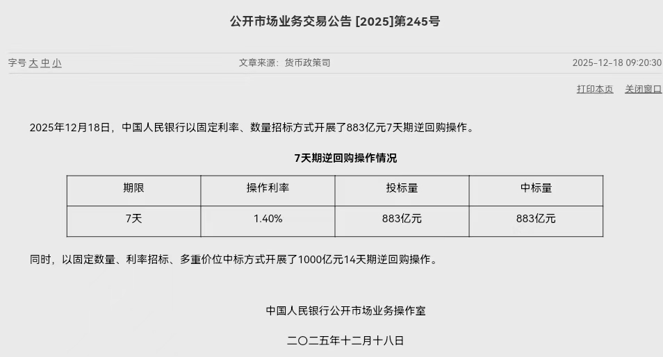 央行网站12月18日消息,央行今日开展883亿元7天逆回购操作,操作利率为1.40%,与此前持平。同时,央行以固定数量、利率招标、多重价位中标方式开展了1000亿元14天期逆回购操作。