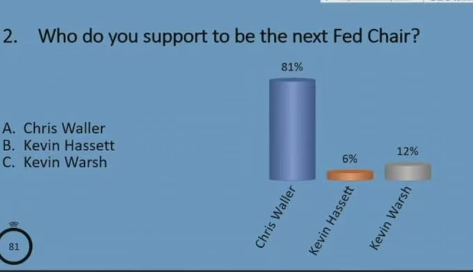 根据Timiraos当日发布的一项调查数据,当主持人对在场的首席执行官们发起投票,询问谁应该成为下一任美联储主席时(选项是沃勒和另外两位备受关注的领先候选人沃什和哈塞特),沃勒获得了五分之四的赞成票。中信证券此前在研报中表示,核心角逐在沃勒和哈塞特之间。对特朗普而言,二者是“最适合”与“最听话”之间的比较。沃勒今年11月曾表示,“与美财长进行了愉快且富有成效的会谈。我认为他们正在寻找一位有能力、有经验且熟悉这份工作的人,而我认为我符合这些条件。”