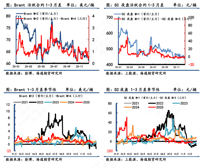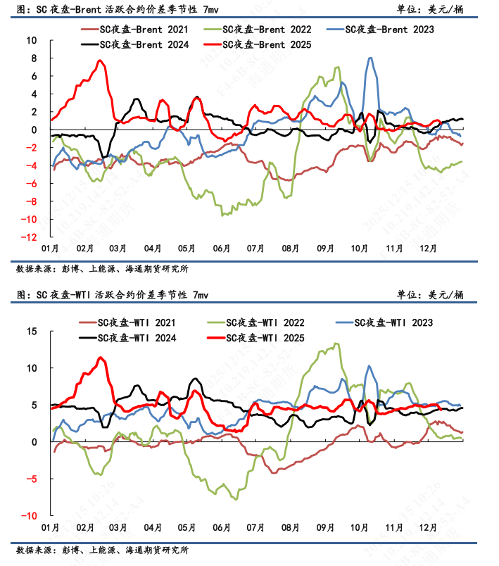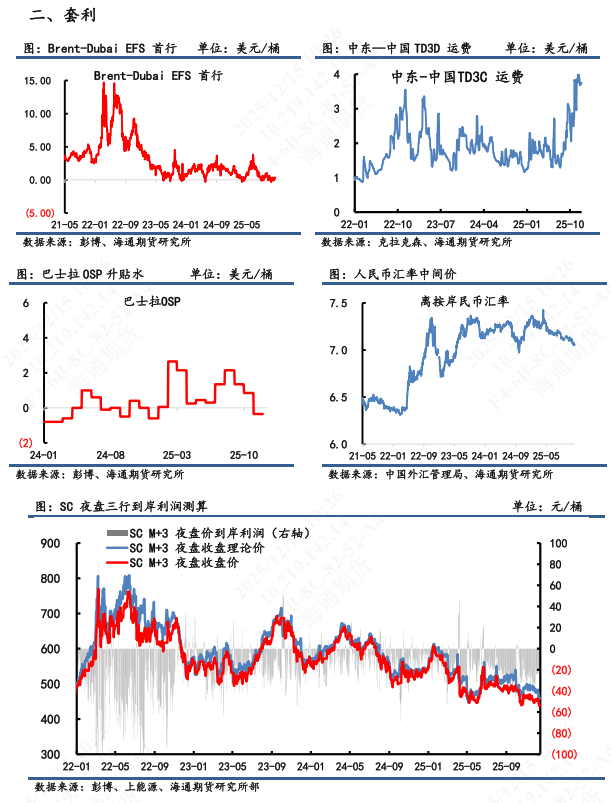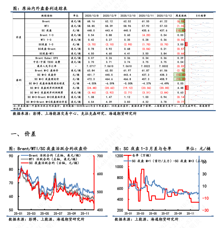 2)套利:①估值:12月12日凌晨2:30,Brent 2602盘面价为61.06美元/桶,SC 2603盘面价为438.3元/桶,测算SC 2603盘面理论价为458.9元/桶,当天盘面估值偏离程度-4.5%。从7天移动平均估值值中,以【-5%,0】为正常区间来看,估值区于常态下沿。②利润:测算SC2603盘面到岸利润-20.00元/桶,折合-2.84美元/桶。③价差:SC2603-Brent2602盘面差为0.94美元/桶,理论差3.78美元/桶,盘面价差低于理论价差。(注:上周Brent首行为2602;SC首行为2601;其中M代表时下12月)