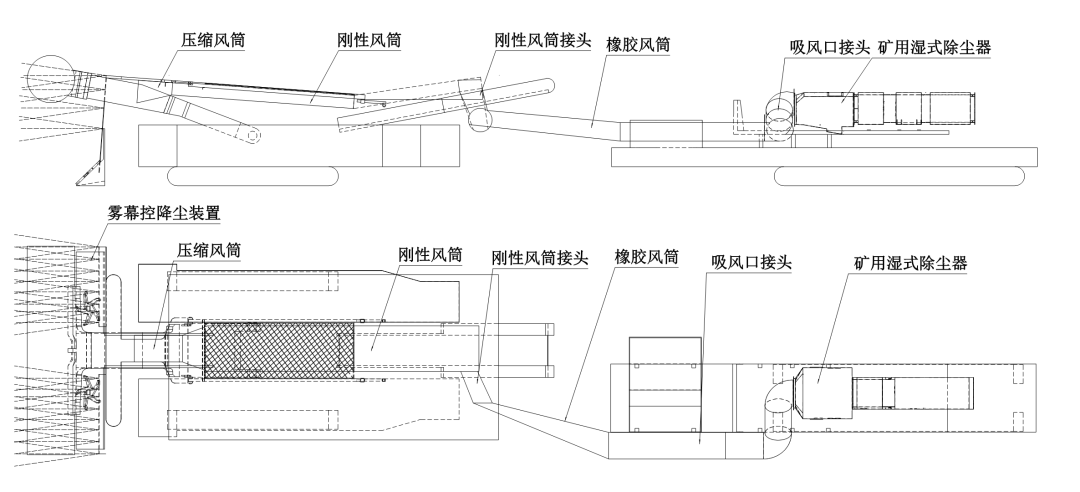 重庆研究院针对上述问题创新性提出了一种“前方掘锚机布置吸尘管道+后方自移机尾安设除尘器+中间柔性橡胶风筒联接”的除尘系统配套工艺,研制出一种风机后置式湿式除尘器,它适用于岩性粉尘特性的高效处理,处理风量可达650m /min。此外,还配合环形外喷雾源头降尘、附壁风筒分风控尘等措施。最终,将低矮半煤岩掘锚工作面的呼吸性粉尘浓度降尘效率由原来的45.3%提高至87.6%以上,迎头作业区域能见度提升至20m以上,作业区域环境得到显著改善。
