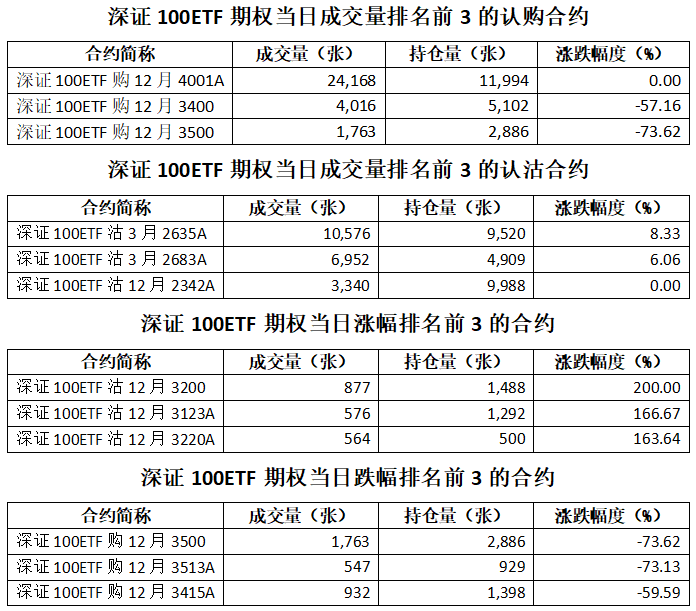 深证100ETF期权总成交面额24.57亿元,减少13.06%,期现成交比为0.01,权利金成交额0.11亿元;期权总成交量71,780张,减少13.15%,其中认购期权成交量36,867张,认沽期权成交量34,913张,认沽认购成交比率为0.95(上一交易日认沽认购成交比率为0.97)。