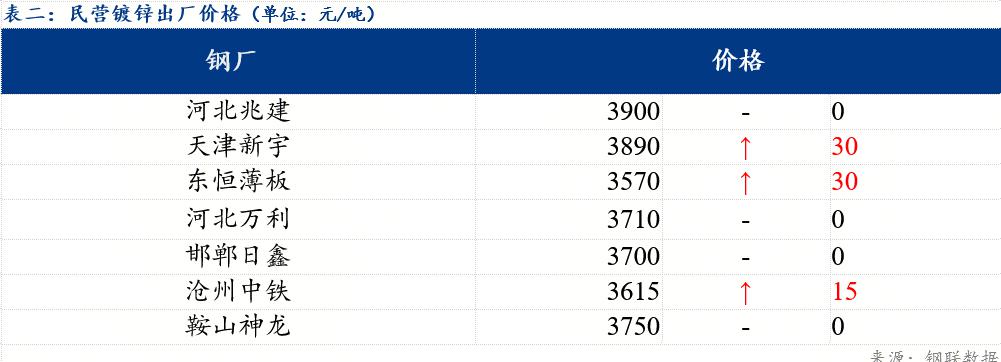 今日北方民营钢厂镀锌出厂指导价在3570-3900元/吨。