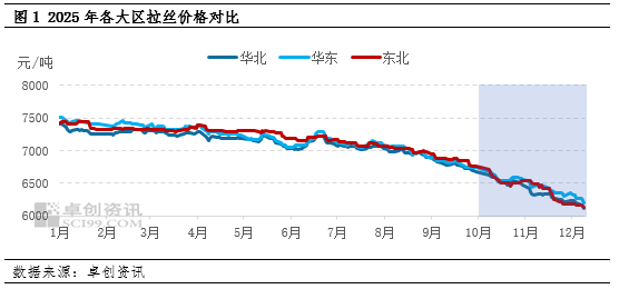 2025年四季度东北PP市场价格呈现跌后小涨又回落的走势,价格重心较上季度继续下移。10月上旬,受生产企业库存压力增加及下游需求释放不及预期影响,市场价格下跌明显;10月下旬,原油价格上涨,成本端支撑增强,叠加期货价格小幅反弹,提振市场情绪。同时,区域内装置检修集中,现货资源紧张,加之东北地区收获季节塑编袋需求增加,推动市场价格小幅上涨。11月上旬,受前期装置检修的影响,东北区域内现货资源并不宽松,生产企业多挺价为主,货源成本支撑较强,下游多谨慎刚需补货,持货商实盘让利促成交,市场价格虽有下跌,但跌幅有限;11月下旬到12月上旬,区域内装置多稳定生产,前端生产企业存在一定的累库情况,供应压力增加,市场价格连续下跌,叠加期货连续下行,下游观望情绪加重,在供需双弱的拖累下,东北PP市场价格跌幅扩大。截至12月17日,四季度东北PP拉丝市场均价在6378.92元/吨,较三季度下跌8.81%。