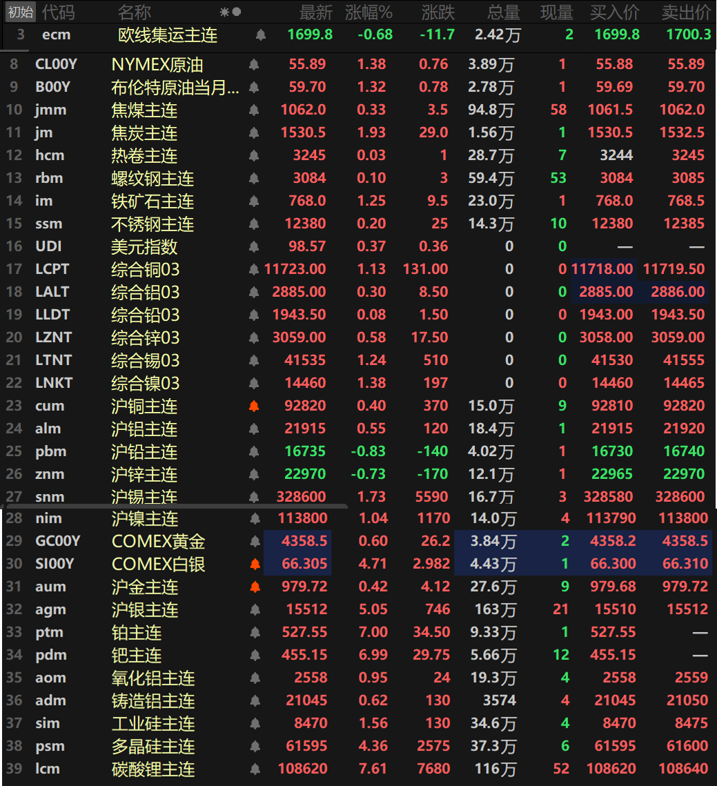 此外,碳酸锂主连大涨7.61%,工业硅主连涨1.56%,多晶硅主连涨4.36%,多晶硅主连盘中最高冲至61985元/吨,刷新其上市以来的历史新高。欧线集运主连跌0.68%报1699.8。
