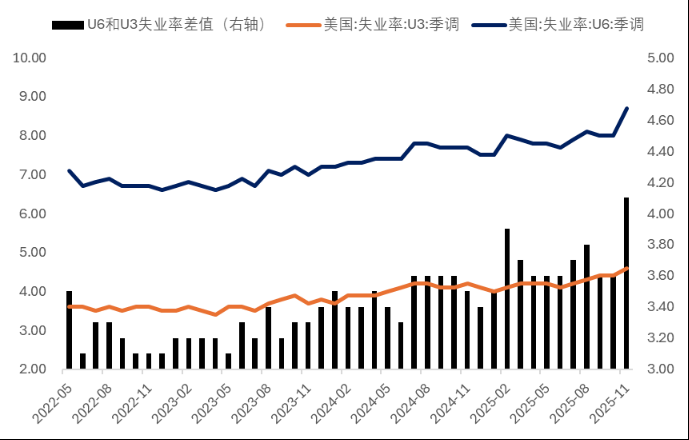 3、 失业率水平现已超过FOMC委员对长期失业率预估区间的上沿,表明FOMC已不再满足其"最大就业"的政策目标,美联储官员近期反复强调就业市场的下行风险,本次超出预期的失业率或为后续联储降息提供较强依据。若接下来发布的通胀与就业数据不及预期,或将进一步强化2026年上半年美联储展开两次25基点的降息预期。