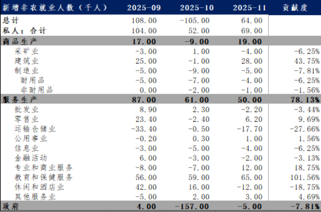 1、 本次非农就业报告整体仍印证了美国劳动力市场的放缓态势,非农就业人数在10月出现10.5万人的收缩后,虽于11月小幅回升6.4万人,但两月合计的就业水平仍较9月净减少4.1万人,近三个月移动平均就业增长已降至较为疲软的水平。