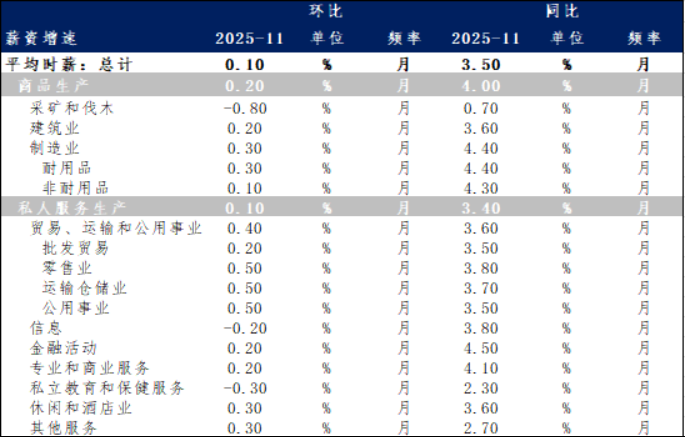 劳动力市场的放缓在失业率指标上得到进一步印证。11月失业率自9月的4.44%上升至4.6%,主因9月至11月期间家庭调查的失业人数增长(+22.8万人)超过就业人数增长(+9.6万人)。值得强调的是,因政府停摆影响数据采集,美国劳工统计局未能获取10月家庭调查数据,并特别指出11月失业率的统计误差可能扩大,但失业率的上行趋势与其他劳动力市场指标(如持续申领失业救济人数)相互印证,共同指向就业条件正在逐步恶化。4.6%的失业率水平现已超过FOMC委员对长期失业率预估区间的上沿,表明FOMC已不再满足其"最大就业"的政策目标,美联储官员近期反复强调就业市场的下行风险,本次超出预期的失业率或为后续联储降息提供较强依据。劳动力市场供需格局的缓和亦对薪资增长构成压制。10-11月平均时薪月率增幅约为0.3%。尽管月环比增速仍大致符合过去一年左右的趋势,但同比涨幅在11月降至3.5%,创下本轮周期新低。