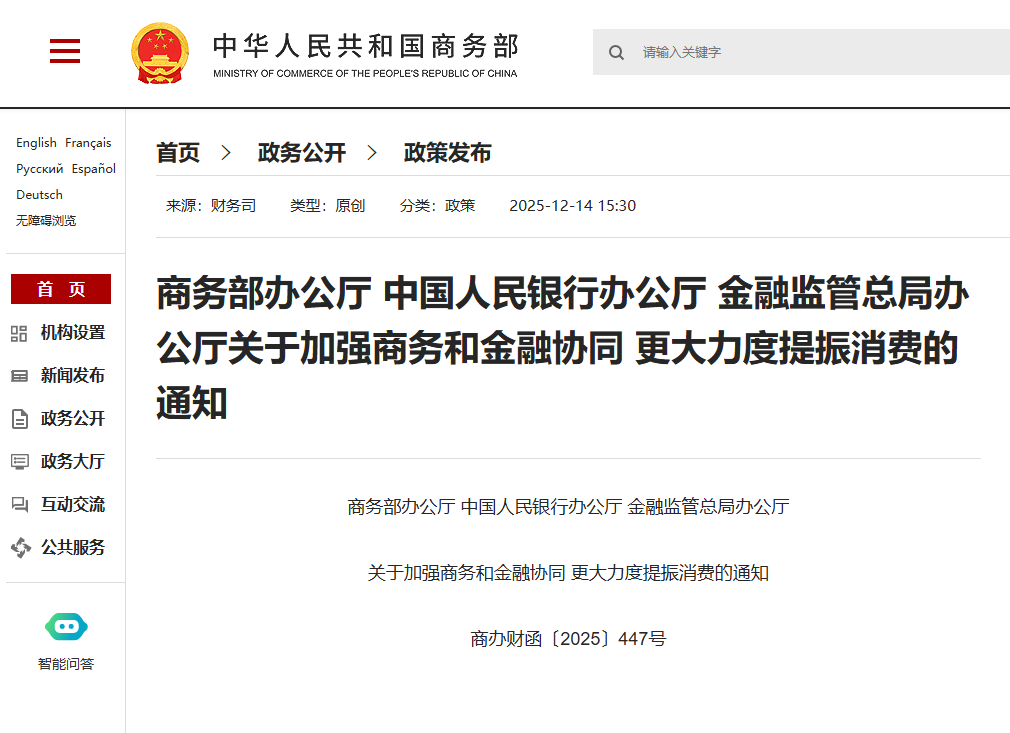 《通知》强调,推动商务与金融系统从机制到行动进行深度协同,通过场景化、精准化的金融产品与服务创新,重点支持商品消费升级、服务消费扩容、新型消费培育及县域消费提振等领域,务实有效地形成提振消费的强大合力。