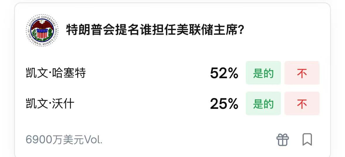 近日,前美联储理事沃什凯文.沃什(Kevin Warsh)与白宫经济顾问凯文.哈塞特(Kevin Hassett)被视为下一任美联储主席的热门人选。日前,曾一度被市场视为几乎板上钉钉的美联储主席候选人哈塞特一度被认为势头不稳。此前,在宣布取消12月初美联储候选人面试后,特朗普又为沃什安排了面试。特朗普在接受媒体采访时表示,沃什已与哈塞特并列,成为美联储主席候选名单中的领先人选。特朗普称,“我认为这两位凯文都很棒。”特朗普这一表态曾导致预测平台Polymarket上哈塞特的胜算大幅下滑,数据一度显示沃什比哈塞特有更大的概率成为下一任美联储主席。