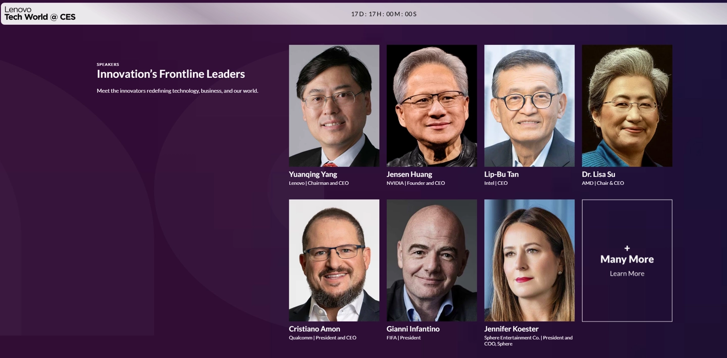 除此之外,联想官网显示英伟达创始人兼CEO黄仁勋、英特尔CEO陈立武、AMD董事长兼CEO苏姿丰、高通总裁兼CEO克里斯蒂亚诺安蒙、FIFA主席詹尼因凡蒂诺、Sphere总裁兼首席运营官Jennifer Koester、微软执行副总裁Yusuf Mehdi、摩托罗拉软件产品营销主管Angelina Gomez等人将会亮相并发表演讲。