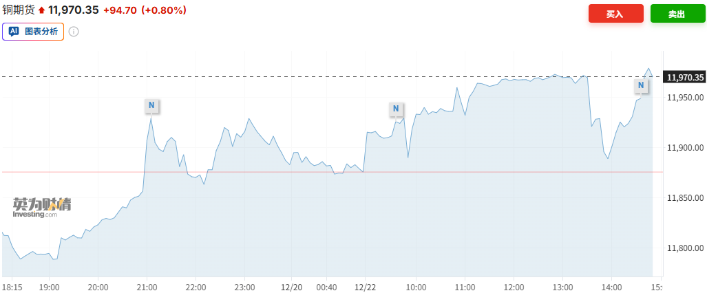 在贸易动荡、供应紧张以及对长期需求乐观情绪主导的这一重大年份接近尾声之际,铜价攀升至新高,逼近每吨12000美元。截至发稿,铜价上涨0.8%,至每吨11970.35美元。铝、锌和镍的价格也均有所上涨。距离年底仅剩几个交易日,LME铜价有望创下自2009年以来的最大年度涨幅。