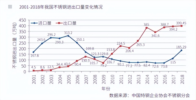 进入新世纪以来,随着我国不锈钢产能扩大,产量快速增长,出口量也逐年 提高。2001年我国不锈钢出口量仅有4.5万吨,2010年增长至153.8万吨,由世界 最大的不锈钢净进口国变为净出口国,改变了长期以来依赖进口的局面。2010年 以后,我国不锈钢出口量继续大幅提升,2018年达到了399万吨,创历史新高。