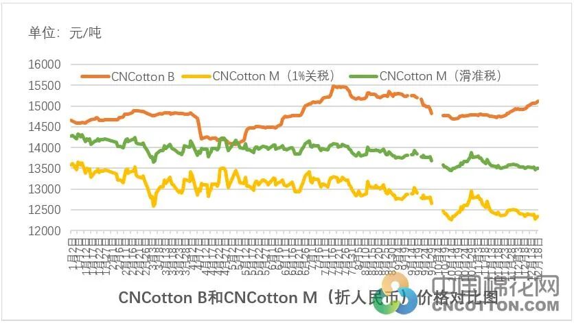 11月下旬以来,棉花市场内强外弱格局进一步凸显,国内淡季需求稳定以及明年种植预期的不确定性促使郑棉期货连续上行,累计上涨近400点。而受本年度美棉供应过剩而出口持续低迷的影响,ICE棉花期货主力合约继续小幅下行,导致内外棉价差进一步扩大。截至2025年12月19日,国家棉花价格指数(B)较国际棉花指数(M)折人民币价格(1%关税)高2774元,较上月同期扩大470元,较M指数的滑准税人民币价格高1624元,较上月同期扩大430元。