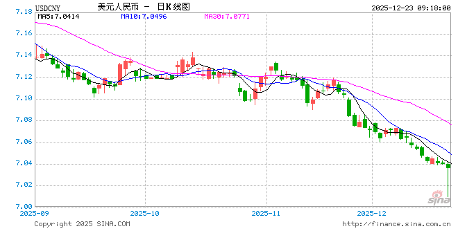 12月23日,人民币兑美元中间价较上日调升49点至7.0523,中间价升值至2024年9月30日以来最高。