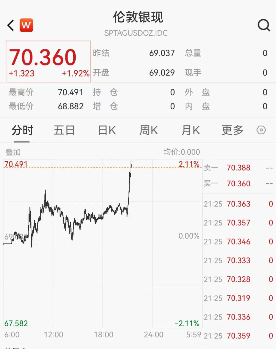 12月23日21:26左右,现货白银涨近2%,突破70美元/盎司关口,续创历史新高。沪银期货主力合约涨逾3%,至16978元/千克,续创历史新高。