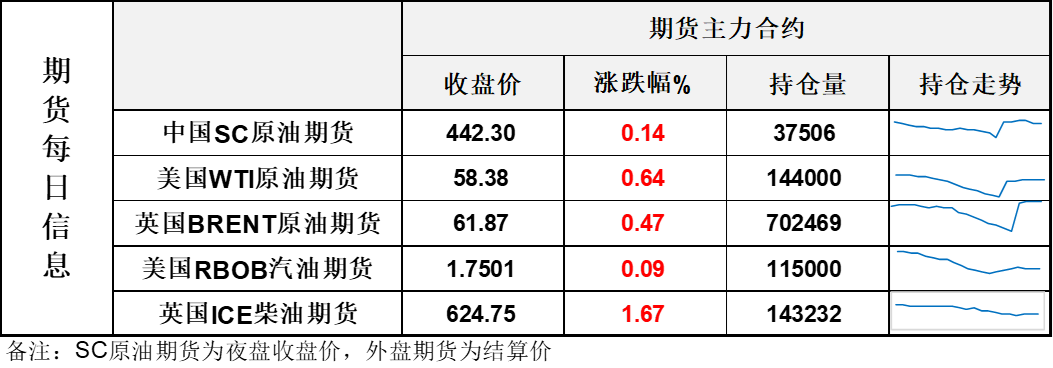 【1】WTI主力原油期货收涨0.37美元,涨幅0.64%,报58.38美元/桶;布伦特主力原油期货收涨0.29美元,涨幅0.47%,报61.87美元/桶;INE原油期货收涨0.14%,报442.3元。