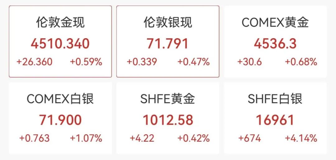 国际贵金属期货普遍上涨,现货白银突破70美元/盎司。COMEX黄金期货涨0.68%,报4536.3美元/盎司;COMEX白银期货涨1.07%报71.9美元/盎司,均创历史新高。