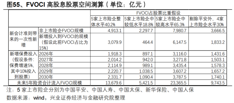 根据兴业证券测算,若按2025年三季度末人身险公司股票资产占资金运用余额的比例(约10%)估算,且假设其中30%计入FVOCI,则未来5年,约7910亿元的来自保费收入的资金有望流入到高股息资产中。