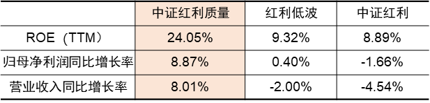 在质量因子的加持下,中证红利质量指数展现出更优的盈利质量,其三季度末ROE(TTM)达24%,明显高于中证红利(8.89%)及红利低波指数(9.32%),反映出成分股在盈利能力方面的优势。同时,今年前三季度营收、净利润增速也更快。