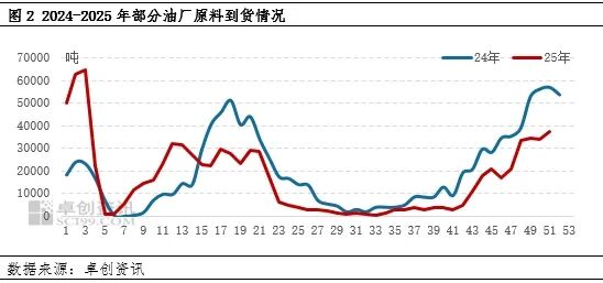 2025产季部分大厂入市时间较晚,直至12月后才陆续收购,整体来看到货量低于去年同期,近期处于缓慢增加状态。随着个别大厂入市收购好货后,部分油厂到货品质改善,好通货价格可达到7900元/吨左右。不过今年油料米潜在供应充足,品质好的油料或相对不多,11月油厂低价油料米到货相对充足,目前控制油料质量为主。截止到12月18日,产季到货25.01万吨,同比下滑40.17%。预计高价货源收购积极性不强,关注年后情况。