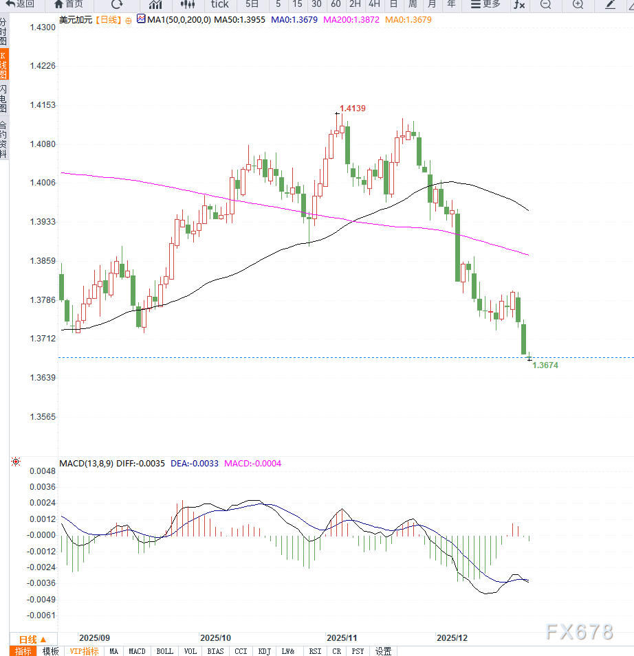 从日线结构来看,美元兑加元(USD/CAD)已进入明显的下行通道。汇价连续多日收阴,并有效跌破前期重要支撑位1.3750,下探至1.3675一线,刷新阶段新低,显示空头力量占据主导。