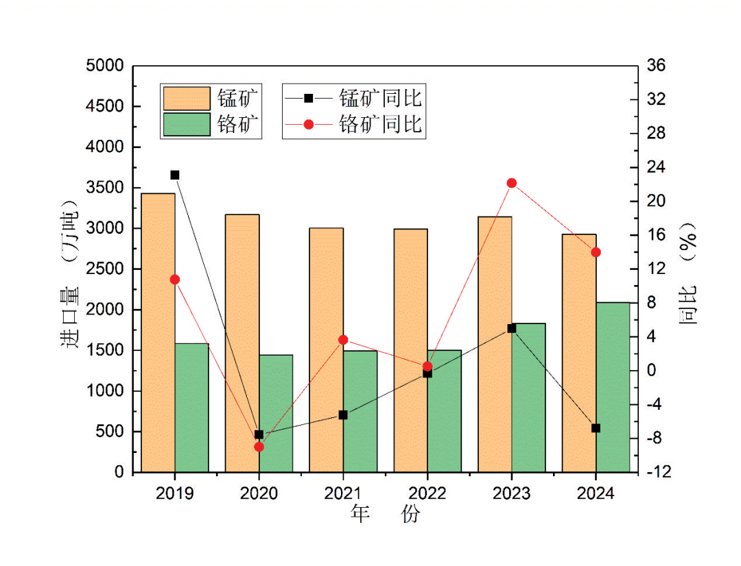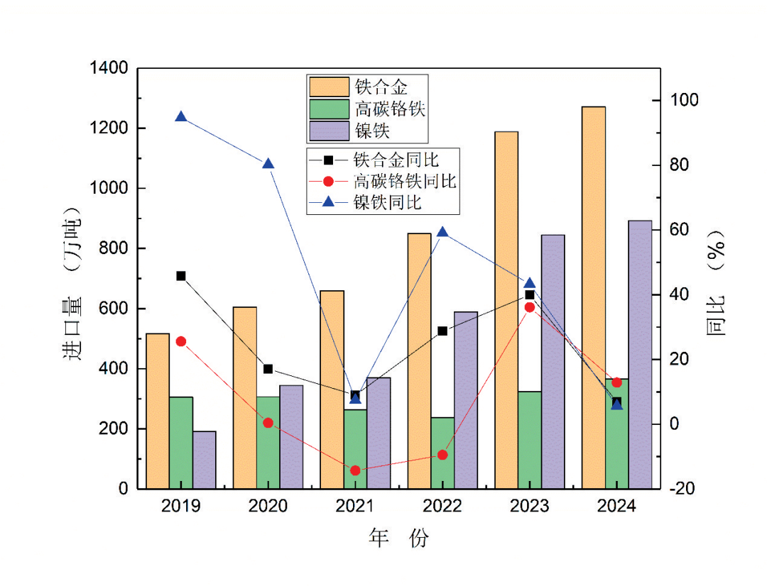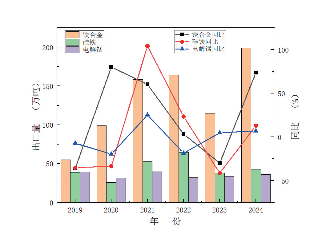 “十五五”时期,中国钢铁行业将转向高质量发展轨道,消费重心从量向质转变,将加大对绿色低碳技术的投资与研发力度,逐渐减少对高碳排放工艺的依赖。因此,铁合金国内表观消费量将减少,需求量将下降,产量将进入下降通道,但也不排除一些年份波动回升反复。在进出口方面,受世界经济增长放缓、国外铁合金市场需求下降,同时进口锰矿、铬矿等原料市场波动性加大,不确定性增加。