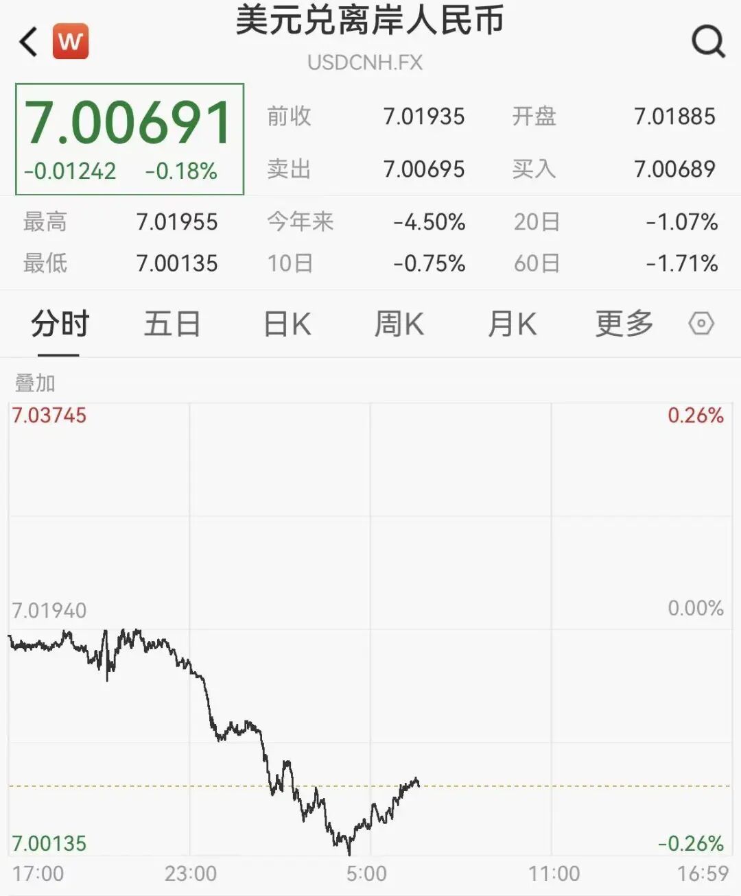 进入12月之后,人民币出现强势迹象。12月15日,美元兑人民币离岸价继续走低,一天下跌超过100个基点,一度触及7.04263;12月23日,7.02也宣告失守;12月24日,7.01被击穿,最低触及7.00621,美元指数也同步走低,最新徘徊在97.8附近。同一天,人民币对美元中间价调升52个基点,报7.0471,创2024年9月30日以来最高。