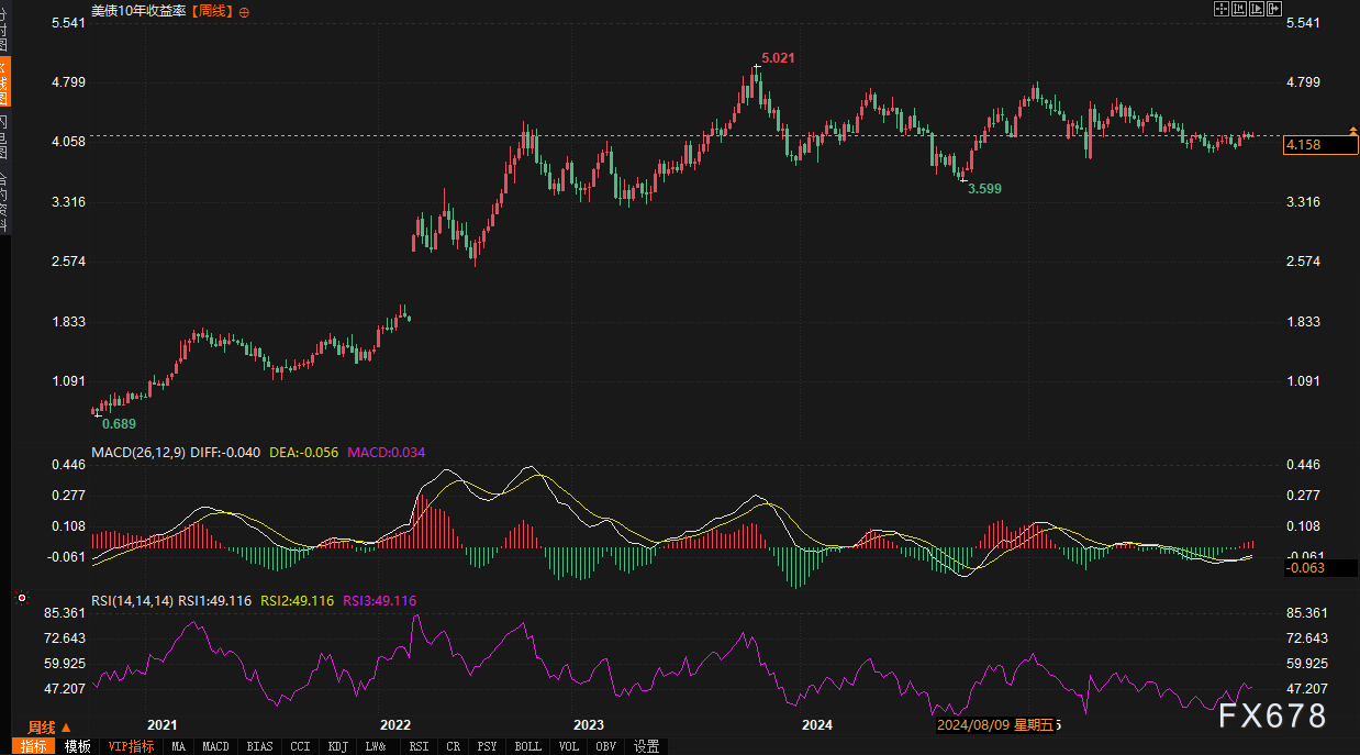 10年期美债收益率周线图同样呈现下行趋势。其MACD指标DIFF与DEA值亦为负值,柱状线转正表明空头动能有所减弱,但整体格局依然偏弱。RSI读数接近中性的49.2,显示短期多空力量相对均衡,但下行风险依然存在。收益率从年初高位4.832%震荡回落,9月以后基本被限制在3.9%-4.2%的区间内运行。这一区间的形成逻辑,在于通胀放缓预期与全球央行政策分化的相互制衡:下沿3.9%附近构成支撑,逻辑基于全球避险资金对优质债券的配置需求;上沿4.2%则构成阻力,多次测试后均未能有效突破。4月中旬收益率一度暴涨12.41%,却未能形成持续升势,反映出市场对利好数据的反应具有选择性且缺乏信心。