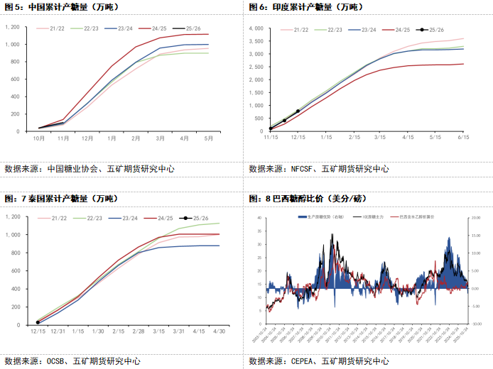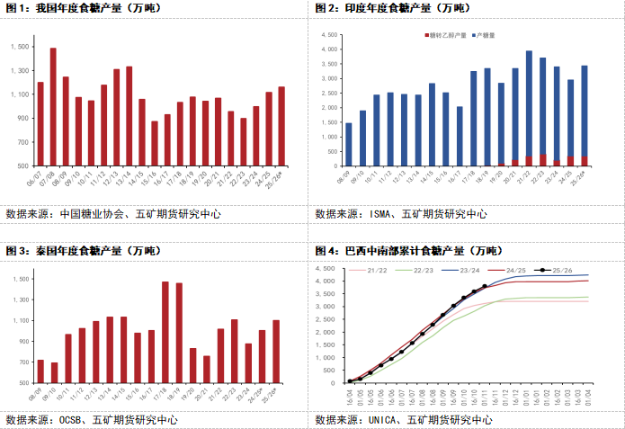 北半球主产国已经全部进入新榨季生产期。截至目前来看,印度增产比较明显。中国和泰国因开榨时间稍晚,当前累计产量略低于去年同期。印度方面,根据印度全国甘蔗和糖业联合会(NFCSF)发布数据显示,截至12月15日,印度2025/26榨季共有479家糖厂开机生产,同比增加6家;累计产糖779万吨,同比增加172万吨,增幅28.34%。预计2025/26榨季食糖总产量(包含糖转乙醇产量)为3435万吨。其中340万吨糖用于生产乙醇,食糖净产量预计为3095万吨,同比增产485万吨,增幅19%。泰国方面,根据泰国甘蔗和糖业委员会办公室(OCSB)发布数据显示,截至12月15日,泰国2025/26榨季累计产糖28万吨,同比减少6万吨。预计2025/26榨季食糖产量为1100万吨,同比增加95万吨,增幅9.45%。中国方面,根据中国糖业协会数据显示,截至11月底,中国2025/26榨季累计产糖63万吨,同比减少34万吨。预计2025/26榨季食糖产量为1160万吨,同比增加44万吨,增幅3.94%。