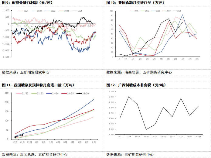 据海关总署公布的数据显示,2025年11月份我国进口食糖44万吨,同比减少9万吨。2025年1-11月我国累计进口食糖434万吨,同比增加38万吨,2025/26榨季截至11月底我国进口食糖119万吨,同比增加12万吨。11月我国进口糖浆、预混粉合计11.44万吨,同比减少10.82万吨。2025年1-11月我国进口糖浆、预混粉合计111.91万吨,同比减少106.71万吨。2025/26榨季截至11月底我国进口糖浆、预混粉合计22.99万吨,同比减少21.87万吨。目前进口糖源供应开始逐步减少,并且历年一季度进口量是全年低位,等待国产新糖上市压力消化后,国内糖价或许能有一轮反弹。