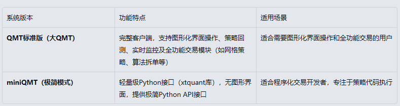 miniQMT是QMT系统的极简模式版本,两者主要差异如下: