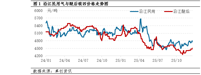 2025年沿江价格震荡区间明显变大,民用气最高5670元/吨,出现在4月,最低4445元/吨,出现在8月,高地价差1225元/吨。醚后碳四最高5420元/吨,出现在1月,最低4260元/吨,出现在10月,高低价差1160元/吨。