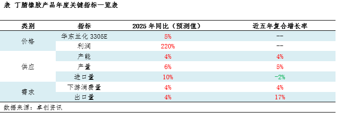 内需方面,预计2025年中国丁腈橡胶下游消费量同比或增长4%。从各机构公布的终端数据来看,首先工程机械产量保持增长韧性,国家统计据公布数据显示2025年1-11月挖掘机产量同比增长16.2%,带动丁腈橡胶消费量增长。其次,在汽车行业方面,中汽协公布数据显示1-11月传统燃油车产量同比下滑1.41%,但插电式混合动力汽车同比增长16.6%,这一增长部分弥补了燃油车产量下降对丁腈橡胶消费的影响。最后从房地产数据来看, 国家统计局公布数据显示1-11月全国房地产新开工面积同比仍有20.5%的下滑,对丁腈橡胶消费量增速形成制约,但是下滑幅度相比去年已有所收窄,市场等待托底企稳。出口方面, 预计2025年中国丁腈橡胶出口量或同比增长4%,增幅明显低于近5年的平均增速。近三年来,部分生产商积极开拓国际市场,叠加地缘因素影响下的转口贸易带动,中国丁腈橡胶出口量持续增长。但2025年9月25日,印度商工部宣布对涉华丁腈橡胶征收为期五年的反倾销税,这对中国丁腈橡胶出口构成压力,10-11月中国丁腈橡胶出口量接连下滑。