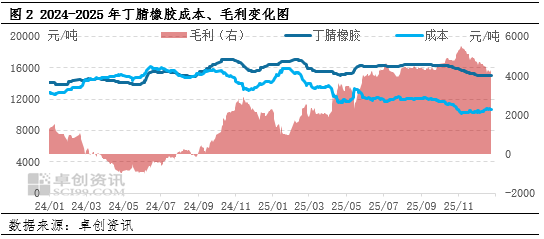 2025年丁腈橡胶行业生产利润显著提升。卓创资讯丁腈橡胶利润模型显示,截至2025年12月24日,丁腈橡胶年均单吨利润较2024年提升近2500元。2025年随着丁二烯价格回落,丁腈橡胶行业的生产成本压力减轻,盈利状况显著改善。不过,在终端需求复苏缓慢且施压制品降价情况下,下游企业难以将原料成本有效转嫁给消费者,这限制了丁腈橡胶市场价格的提升。