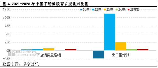 产量方面,预计2025年中国丁腈橡胶总产量同比增长6%。在装置扩能推动以及生产利润较为可观吸引下,丁腈橡胶产量继续攀升。但由于供应过剩问题较为突出,部分生产企业对生产节奏进行了更为谨慎的调控,这使得丁腈橡胶价格底部保持了一定的韧性。进口量方面,预计2025年中国丁腈橡胶进口量同比增长10%。进口量增长点主要在近洋货源,年内国际市场丁二烯价格显著下降,减轻了成本压力,亚洲地区的丁腈橡胶供应量有所增加。同时,由于美国阶段性实施对等关税,日韩向美国出口的丁腈橡胶数量明显减少,部分货源转移至中国市场。