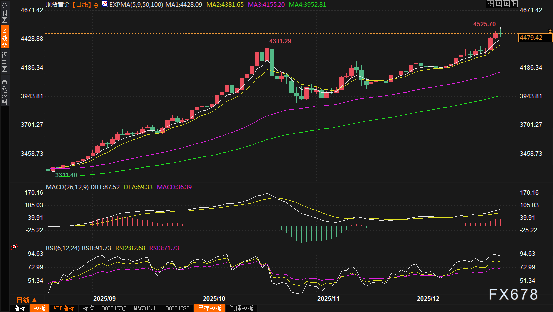 汇通财经APP讯——现货黄金价格在圣诞假期前夕的最后一个活跃交易日(12月24日)中收报于约4479.42美元/盎司,此前曾在日内触及4525美元的历史新高,美国黄金期货价格收报在4505美元左右。由于圣诞节期间交易流动性较为稀薄,周三(12月24日)尾盘整体呈现出平静的态势,黄金价格在4450美元至4500美元区间内徘徊。这种稳定表现被多家市场报告描述为在强劲上涨后的自然盘整阶段,许多交易者选择在年末锁定部分利润。