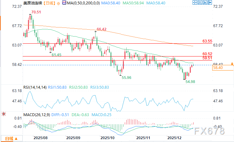 当前走势正是交易商重点关注的行情。假日期间的反弹一定程度上得益于地缘政治消息面——委内瑞拉附近油轮遭扣押以及乌克兰袭击俄罗斯能源资产,这些因素推动买家重返市场。但目前的问题是,市场是否有足够动力突破50日均线阻力。数月来,卖家一直利用该区间压制市场,此次可能也在伺机而动。