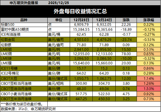 股指:美股休市,上一交易日股指上涨,国防军工板块领涨,综合板块领跌,市场成交额1.94万亿元。资金方面,12月24日融资余额增加101.27亿元至25247.23亿元。在制度进一步完善、资金再度扩容、产业持续赋能等多重维度利好下,A股的长牛慢牛格局有望得到巩固,形成 “政策托底、资金护航、产业驱动” 的三重共振。12月美联储如期降息有望再度提升全球资本流向与风险偏好,资本市场持续改革将进一步巩固慢牛基础。随着12月重要会议基调逐步落地,积极政策信号与美联储降息形成共振,市场风险偏好有望再度提升。