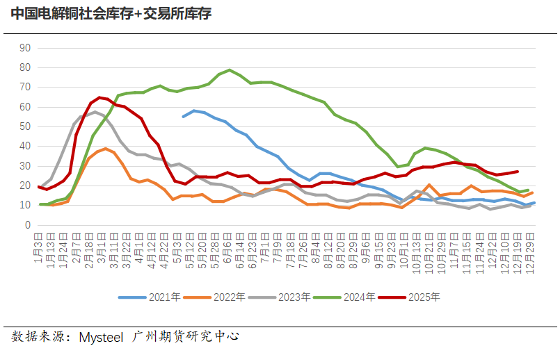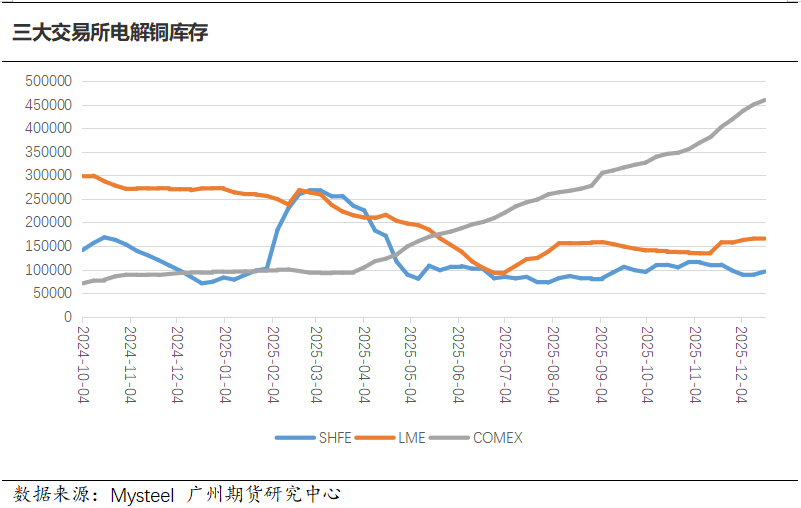 2025年COMEX铜仓单库存已从年初的约9万吨增加至12月24日的约48万吨,据市场反映还有大量的社会库存囤积在美国。从目前能统计到的数据去算,LME+SHFE+COMEX+中国保税区+中国社会库存,合计约100万吨。据ICSG数据,2024年美国消费电解铜162万吨,仅占全球约6%,而其国内的库存(未包含在途及社会库存)却占据了全球的近50%,这意味着剩余全球94%铜的消费区域所拥有的铜库存不到一半,且这种态势仍在继续演绎。就当前而言,因CL价差仍有一定套利空间,且COMEX期铜盘面维持CONTANGO结构,持有现货的同时在远期套保仍有利可图。虽当前美国已累积大量现货铜,短期流出概率不大。该矛盾缓解之前,非美地区铜供应紧张预期将持续存在。市场担忧如果春节后国内开启季节性补库或引发现货的极度紧张态势,投机资金提前抢跑预期交易。重点关注国内春节前后社库及交易所库存季节性水平及变化,其将直接验证阶段性供求状态。